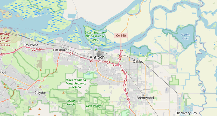 • 安条克河滨公园(Antioch / Oakley Regional Shoreline): Bridgehead Rd 和 Wilbur Ave. 有五百呎长的码头提供钓鱼和欣赏河景.